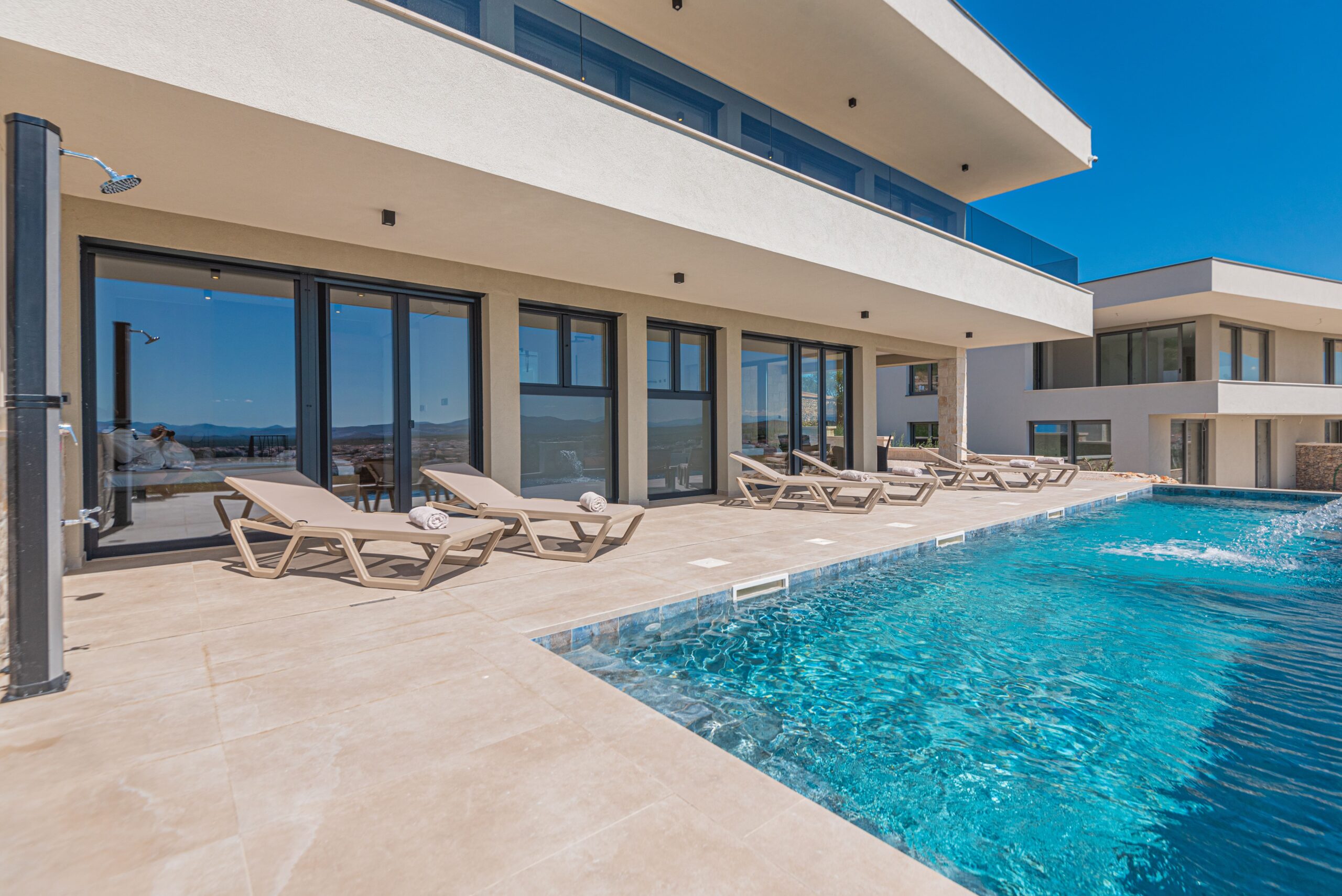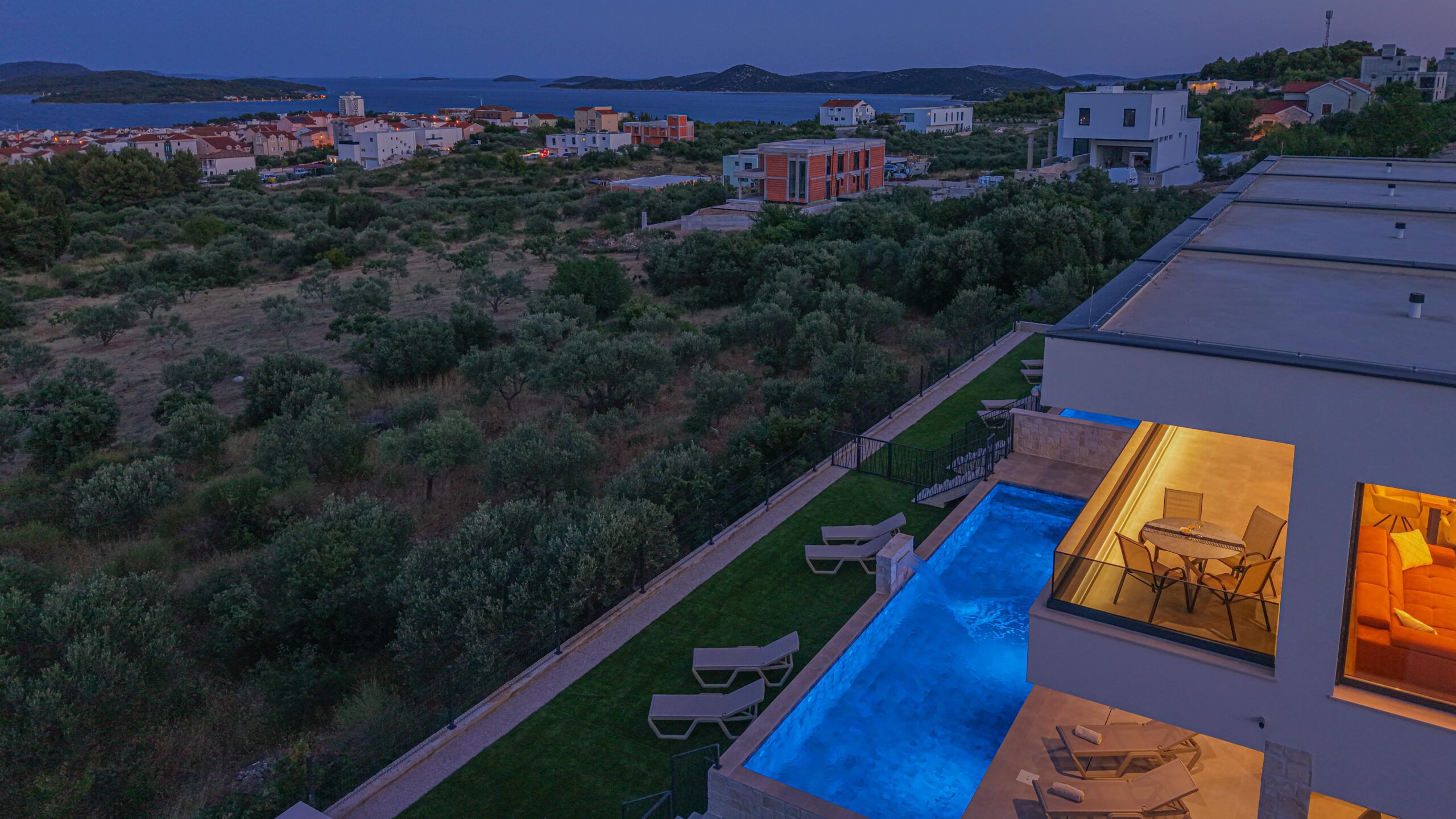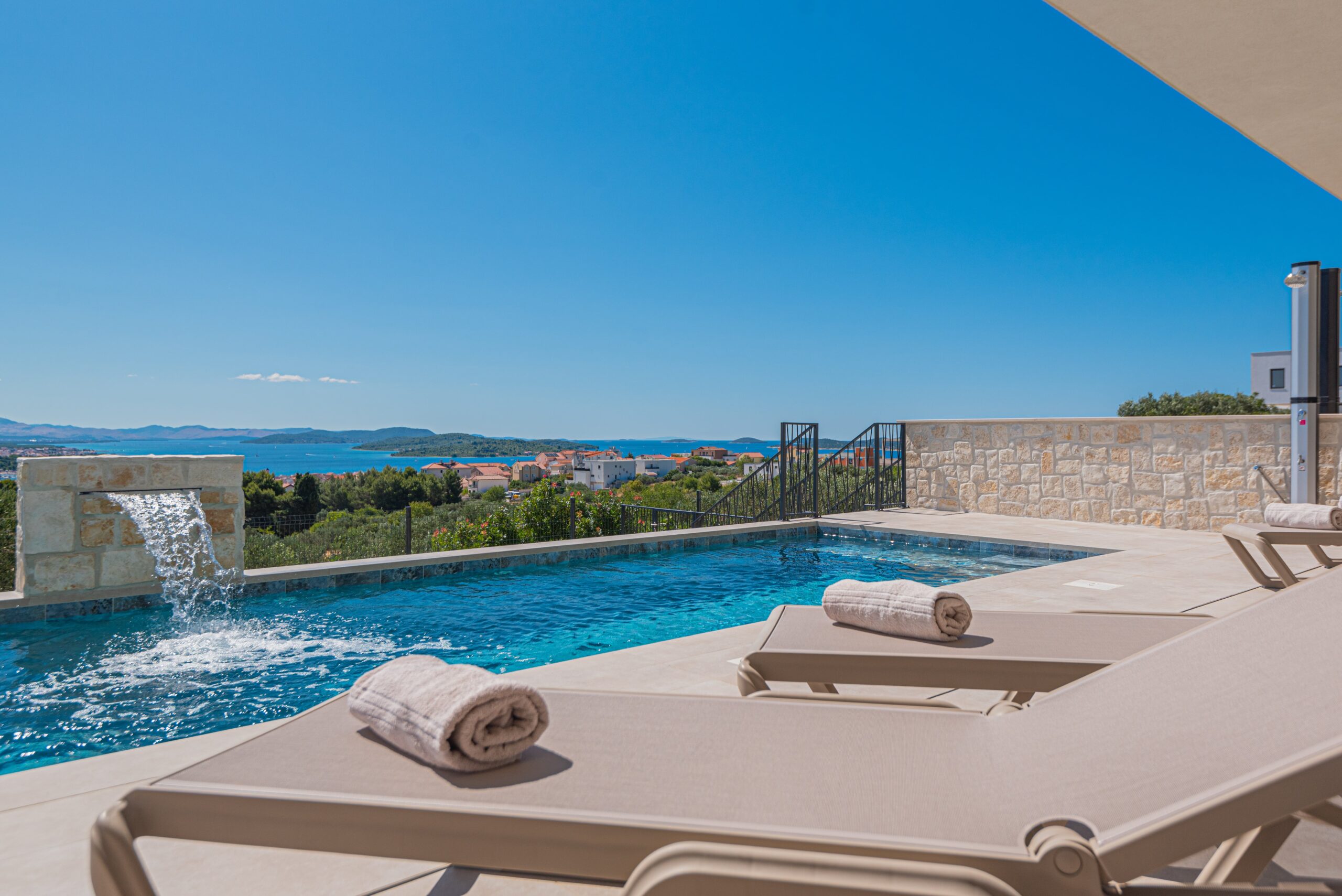 The villa is enthroned in the hills above Vodice and offers a breathtaking view of the offshore islands of Šibenik, the picturesque town of Vodice and the wide, glittering sea.
